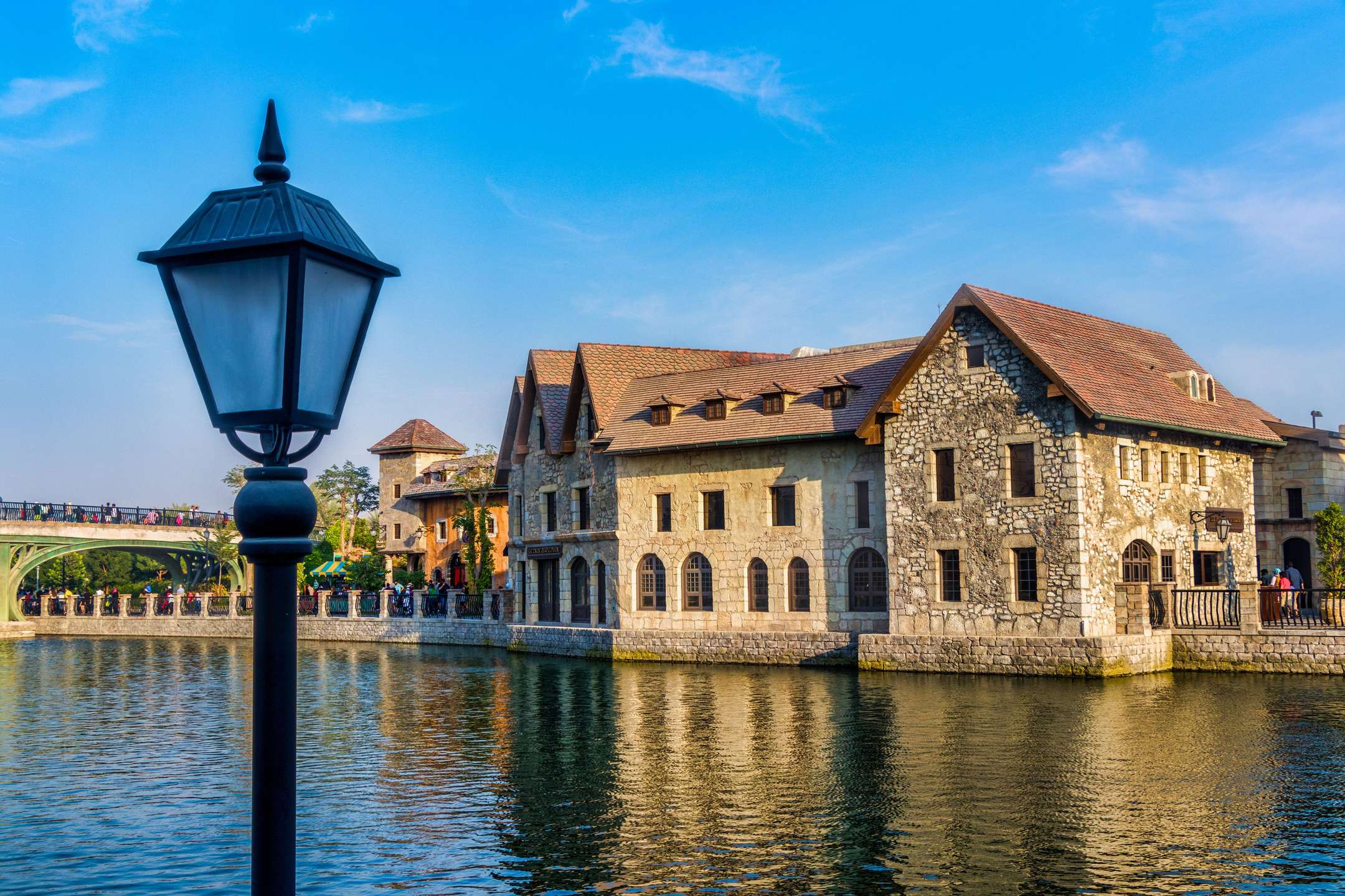 The French Village will transport you to 16th century Dijon, France, with its cobblestone roads and stone bridges. A functional water wheel across the river can be found in the village's central "town square." You will be accompanied by the sound of classical French music as you travel along the winding roads between olive trees and structured buildings.
